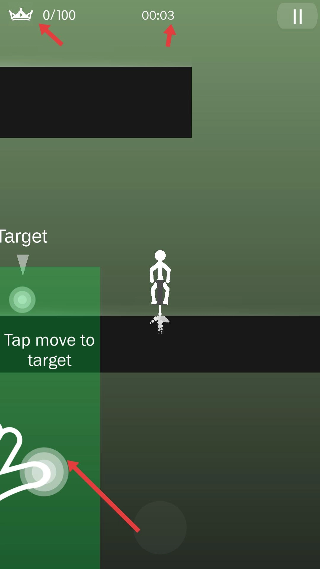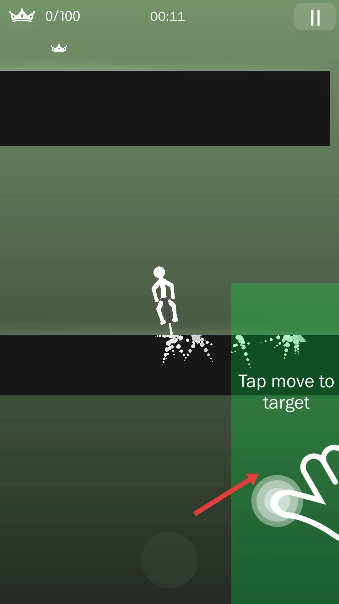 继续操控小人,随着时间的推移,按照箭头提示点击右侧的目标区域,引导小人移动,同时注意皇冠进度和计时,保持好移动的节奏。