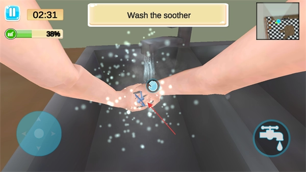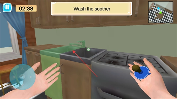 看到屏幕上方出现“Wash the soother”的提示后,用左侧的虚拟摇杆操控角色移动到水槽旁边,为清洗安抚奶嘴做准备。