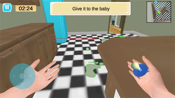 清洗完成后,根据提示“Give it to the baby”,操控角色离开厨房,前往宝宝所在的地方。