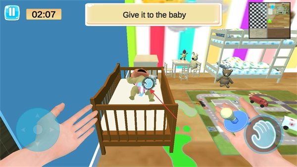 走到宝宝的床边,点击右下角的手掌图标,把清洗干净的安抚奶嘴递给宝宝,就能完成这个任务啦。