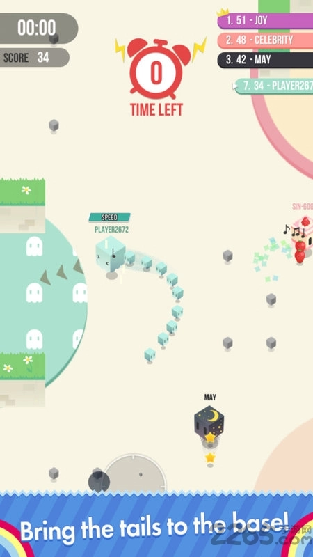 每局游戏都设有时间限制,时限一到,得分最高的玩家便成为本局冠军。玩家得分的方式是拾取尾巴并将其带回自己的基地,每成功带回一个小点点就能获得一分,只要积累足够多的分数就能获胜。当然,专门去抢夺其他玩家的尾巴也是一条快速积累分数的“致富”途径。