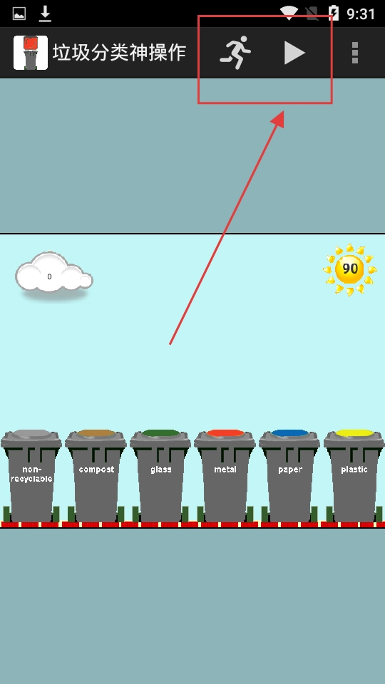 点击页面上方的奔跑图标与播放按钮,即可启动垃圾分类游戏。游戏过程中会持续掉落各类垃圾,需要你迅速做出反应,将它们正确分类投放。