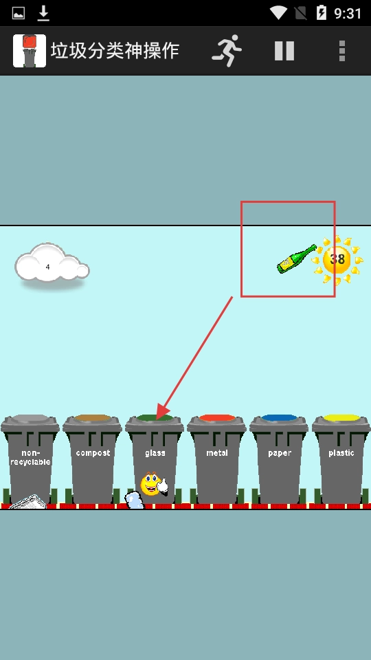 在游戏里辨认掉落垃圾的种类,把它们拖进对应的垃圾桶,比如玻璃瓶要放进glass桶,分类正确就能获得积分。