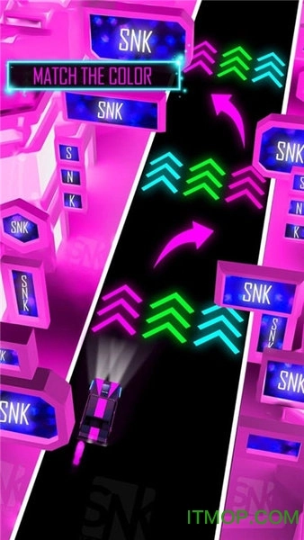 你得时刻留意赛车颜色的变化,只有通过和赛车颜色相同的跑道,才能持续前进并拿到更高的分数。