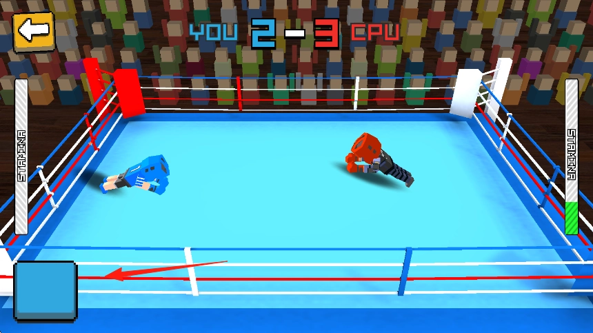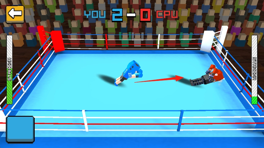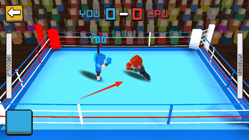 在设有围绳的拳击场中,操控蓝红方块角色,借助左下角的虚拟按键,通过出拳与闪避动作,向对手发起攻击,场边还有观众围观。