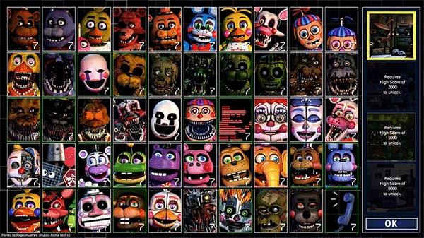 UCN终极自定义夜,一款玩具熊题材打造的诡异冒险游戏,玩家需扮演夜间保安,在充满玩偶的环境中生存到早上 6 点,可从 50 个可选的动画角色中选择敌人,并将其难度设置为 0-20。不同角色有不同行为模式和攻击方式,难度越高,角色行动越频繁、攻击越难应对。