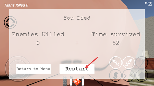 4、若战斗失败出现YouDied提示,可点击Restart按钮从当前关卡起点重新挑战继续推进。