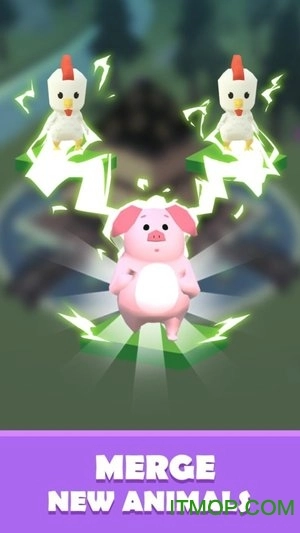 这是一款放置类游戏,通过合并相同的动物,能让它们进化成全新的品种。比如把小鸡合并,就能解锁小猪,森林里的动物种类非常丰富。