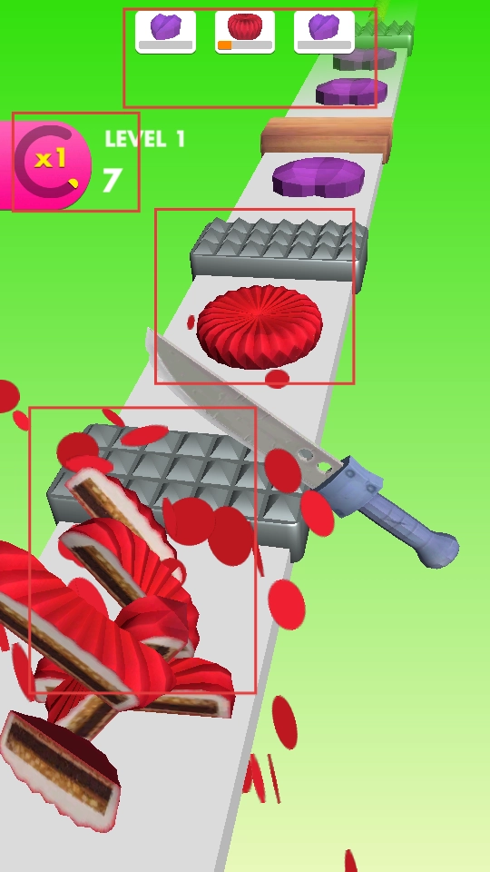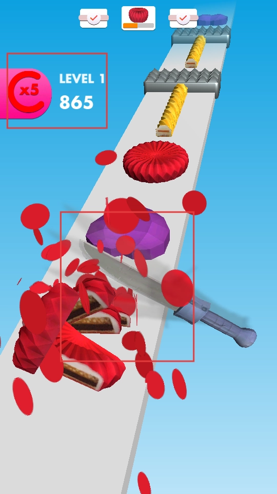 在切割物品的过程中,你将获得相应的分数,界面上方会实时展示当前所处的关卡以及分数倍数等关键信息,所以要尽量切割更多物品来争取更高的分数。