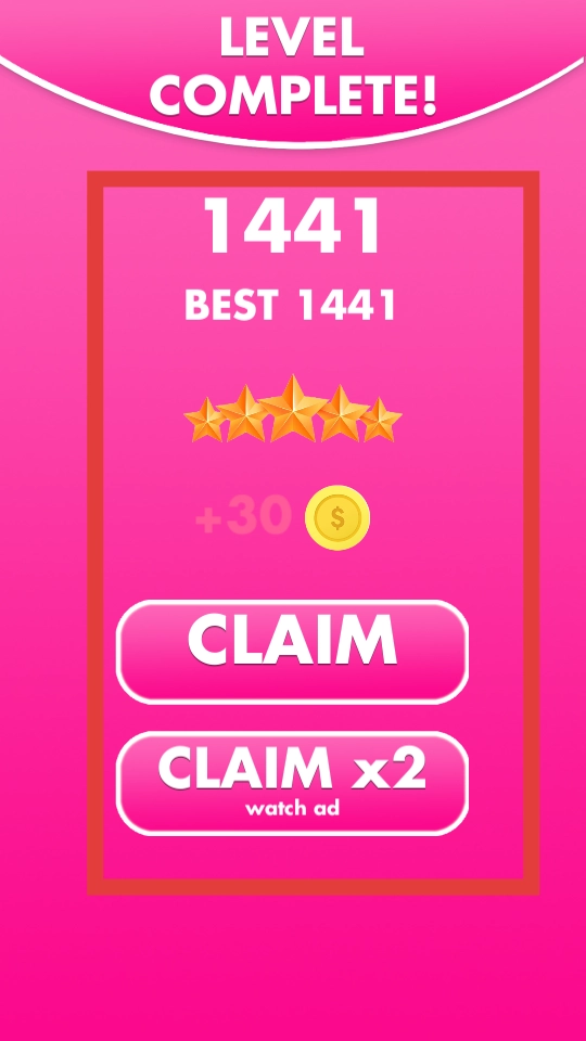 成功通过关卡后,界面会展示当前得分、历史最佳成绩等信息,同时还会发放金币奖励。你可以直接点击“claim”按钮领取奖励,也可以选择观看广告来获得翻倍的金币奖励。