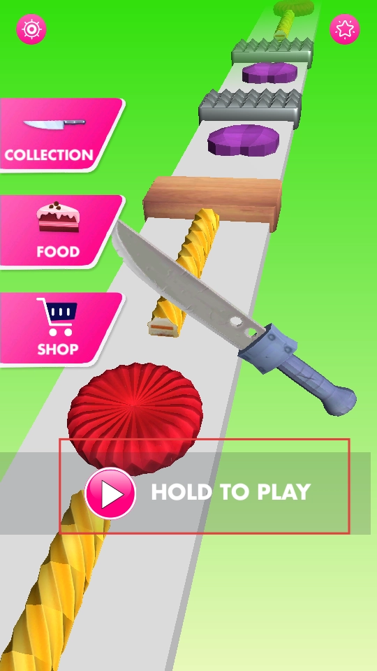 按住“hold to play”按钮,操控刀具在赛道上移动,准备切割各类物品,开启切割挑战之旅。