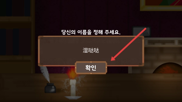 进入游戏后,会弹出命名窗口,在输入框中填写“湿哒哒”,接着点击확인按钮,这样就完成了角色命名的操作。