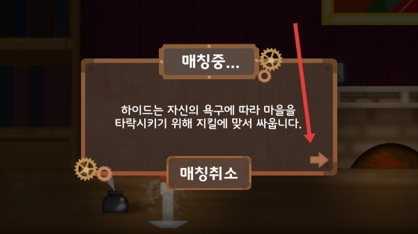 匹配进行时界面会显示“매칭중...”,此时可以点击“매칭취소”按钮来终止匹配流程,也能顺着箭头指示点击查看游戏指南,从而了解当前所处的状态。