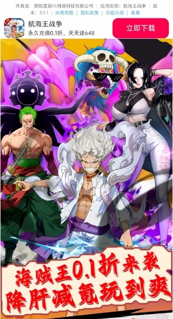 永久充值享0.1折优惠,每日赠送648福利!海量海贼王动漫角色可供挑选!