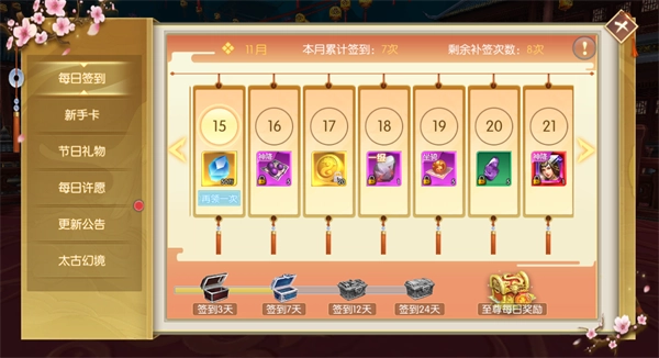 每日签到里偶尔会有仙币奖励,而且开服阶段的每日签到还包含大量稀有物品和绑定仙币,这些都是免费赠送的,强烈建议大家千万别错过。
