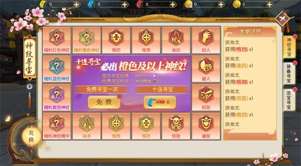 神纹寻宝进行十连抽,必定能获得橙色及以上品质的神纹,其中红色神纹为最高品质。关于神纹寻宝的技巧:每日的免费寻宝机会不要错过,积攒足够的寻宝票后再进行十连抽是最为划算的方式。