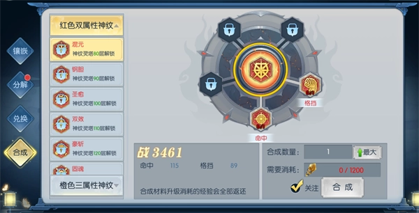 通关高层神纹塔后能够解锁神纹合成功能,该功能可合成双属性、三属性神纹,镶嵌这类神纹时能节省孔位,助力战力大幅提升。