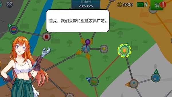 根据新手引导的提示,建议优先协助修复家具制造厂。点击对应的指定位置,就能查看详细的任务说明。