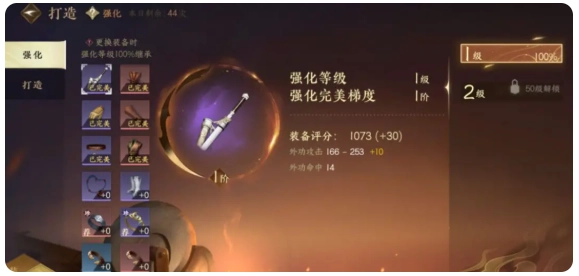 特技分为首领专属特技和非首领特技,总计20种,每种特技又有蓝、红、紫、橙4个品质。打造除了能赋予装备特技外,还可提升其基础属性。无论是特技还是打造带来的属性加成,都能继承到其他装备上。下一次装备部件打造需53级才能解锁,因此第一天可以多进行打造操作。
