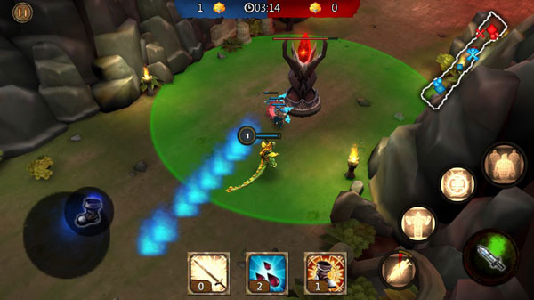 在游戏中玩家一共可以控制三个不同的英雄,通过左下角的英雄头像图标可以实现快速的切换控制。而右侧则是每个英雄的技 能快捷按键,一共有四个,直接点击就能触发技能,直接发动或者需要手动选择释放位置。技能使用会有冷却时间,在技能快捷栏图标的下方会显示冷却时间,另外 底端中间是各种道具的快捷栏,买了道具之后就能在这里点击使用。