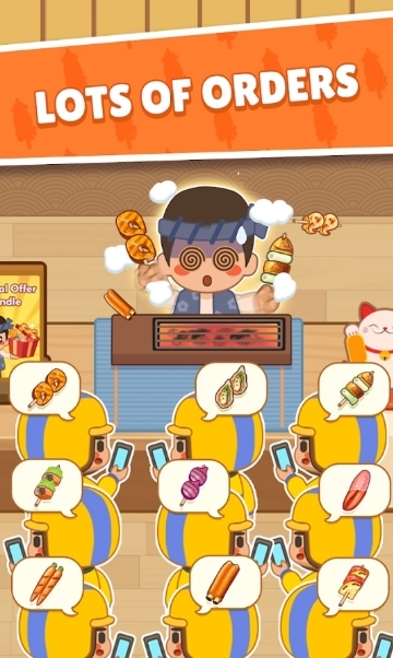 3、满足客人的点单需求,提供美味的烧烤,获取收入,用于购买更多食材、升级设备。