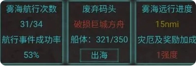 出海 点击出海消耗一次航行次数,提高航行进度并进行事件判定,失败会损失大量船体值,成功则消耗较少船体值随机进入下方三个黄色地点之一,也有小概率遭遇灵兽战斗,遭遇灵兽战斗不消耗船体值。