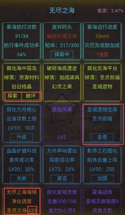 3、出海成功后选择探索类选项会提升神圣值,选择破坏会提升腐化值,但不能同时提升。
