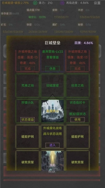 2、可进行回复恢复旧城壁垒血量、刷新回复、建设等、建设增加模块等级等操作。