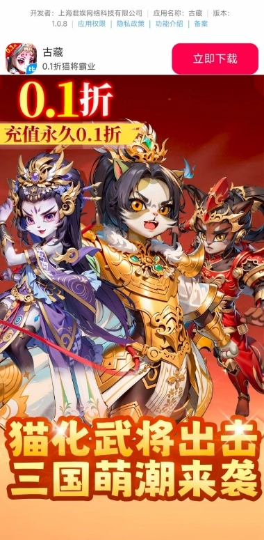 古藏0.1折版游戏是一款将三国历史名将与猫化元素深度融合的卡牌策略,全新福利惊喜0.1折版本更多精彩,游戏以“猫灵附身”为世界观设定,三国武将因猫灵之力获得特殊能力,玩家需招募并培养猫化武将,组建军团参与史诗级战役,最终一统乱世。