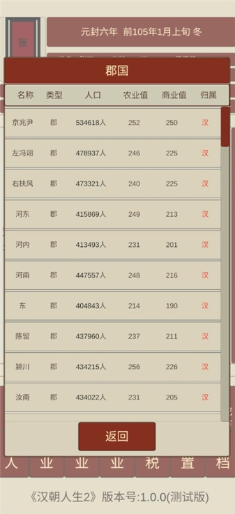 汉朝人生2测试版,一款以西汉为背景的单机文字模拟经营游戏,自立称帝后解锁地方治理玩法,需委派太守管理各郡,太守的军事、政治等四项属性影响治理效果。玩家需制定发展方针,如优先发展农业或商业、调整税收政策,过高易引发叛乱、布置守军防御外敌,平衡民心、经济与军事,确保政权稳定。