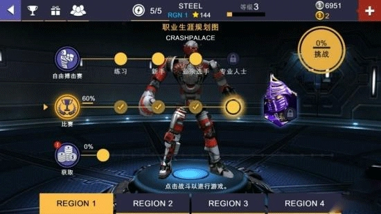 点击地图,里面有三个大分类,自由搏击、比赛和获取(氪金患者必备),难度也是逐渐增加。自由搏击主要是让玩家熟悉游戏的操作,让玩家尽快上手。