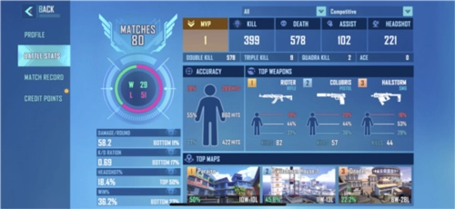 MATR1X FIREE游戏具备完善的玩家数据统计功能,玩家可直接查看丰富的统计维度,涵盖个人段位信息、MVP次数、信誉分状态,以及KDA数据、各地图胜负历史统计等内容。