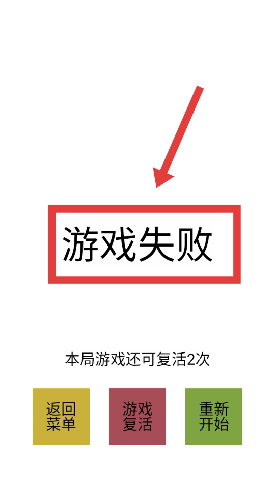 要是消除操作出现失误导致游戏失败,你可以选择游戏复活来重新挑战,或者点击重新开始按钮再来一次,也能够返回菜单选择其他的操作选项。