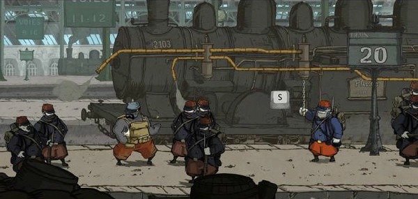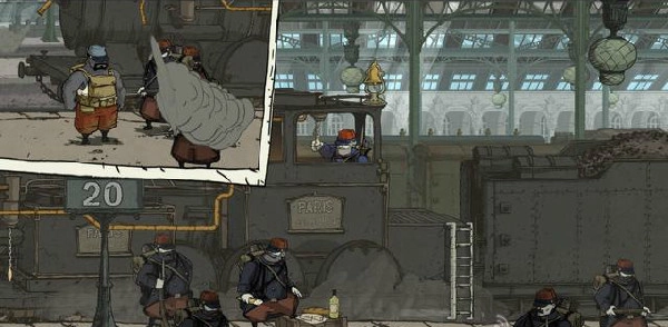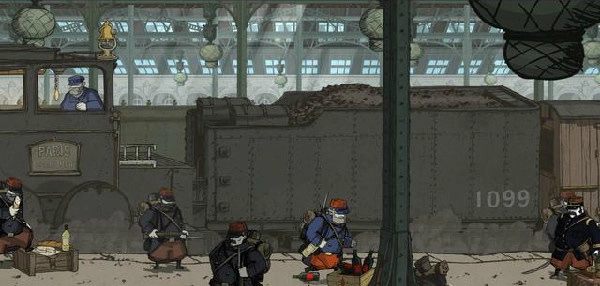 4、接下来的场景中,我们需要登上列车,但梯子被士兵挡住了。在这名士兵旁边有一支军乐队,按照“2-4-3-1”的顺序和乐手们对话,士兵就会自己离开【收集品5】。最后到车顶往左走,拉动另一个链条机关就能赶走另外两名士兵。