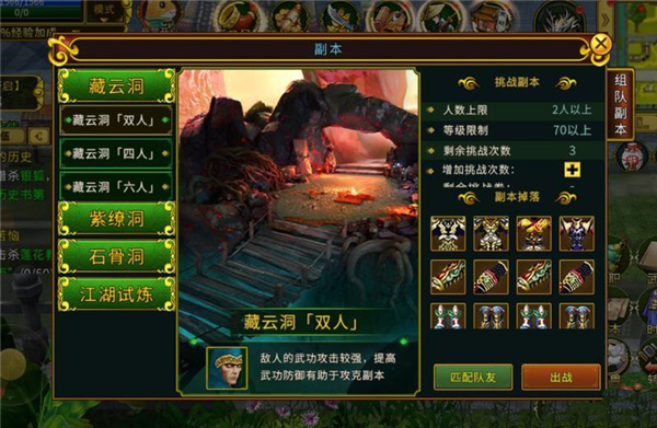第一层的藏云洞,玩家如果通过完成后即可随机获得80级的副本的游戏道具装备。人数多或人数少游戏道具装备获取的也不一样。该活动的精英怪主要是武功攻击,如果打该活动的玩家推荐先把自身的武功防御拉上来再进去打,如果玩家只加了防御的话在该副本会比较艰难。