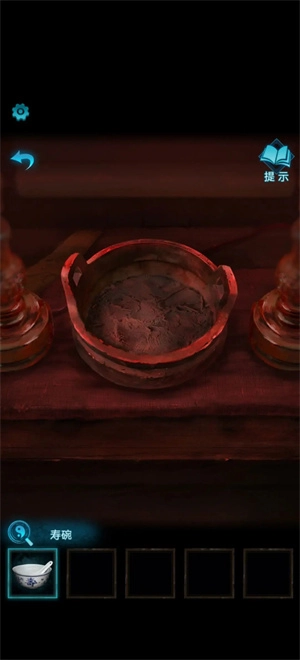 6、总之,打开抽屉,拿到碗和勺子。查看神龛下方的香炉,提示香炉里面有东西,此时用碗把香灰盛出来即可,这样就拿到了一碗灰和香灰铲。仔细瞧瞧这铲子,又长又扁,恰好能用来挑起门栓。