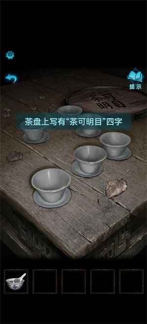 8、查看木桌时,发现上面写着茶可明目。当下没有茶叶,不过手边正好有香灰,便将就用它替代吧。