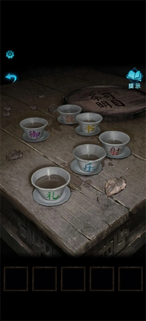 10、走到桌旁,提起水壶将水缓缓倒入茶杯里。这才发现,这些茶杯采用的是见色变色的工艺,随着水注入,茶杯上渐渐浮现出各种颜色的字,分别为:紫御、橙(乘)数、黄书、红射(色)、蓝乐、绿(吕)礼(莉) 。