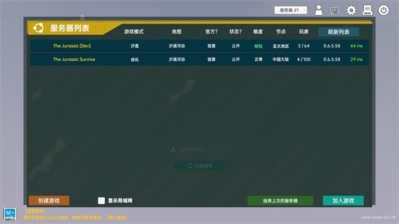 点击开始游戏后可选择不同服务器,当前仅有两个服务器,对应沙盒与进化两种模式。