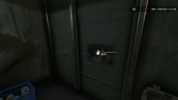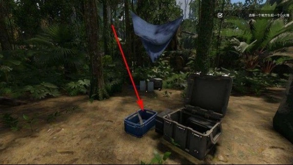 要走出帐篷继续下一步,首先得有一把刀才行。你看下面图片里箭头指的地方,帐篷门口的箱子里就放着刀。