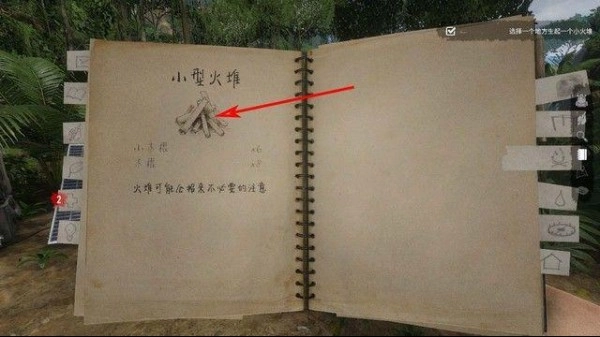 呼出日记界面后,点击右侧的火焰图标,接着点击下方图示箭头指向的小火堆图标,把小火堆蓝图放置在地面的任意位置即可。