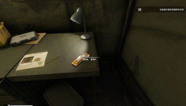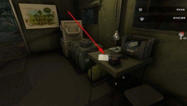 第二天醒来,我发现妻子不在身边,赶紧用步话机联系她,才知道她竟独自去找野人部落了。就像图中箭头标注的那样,帐篷里的桌上放着一张字条,阅读字条就能推进剧情。妻子在字条里说,桌上有给我的礼物——一块多功能手表,它既能定位,也能查看角色状态。