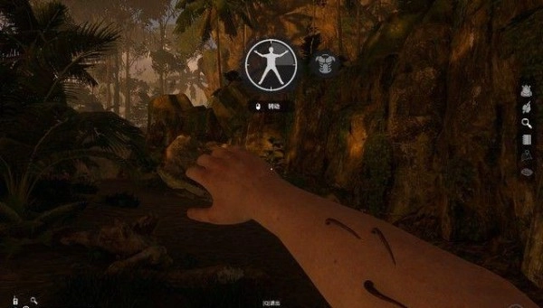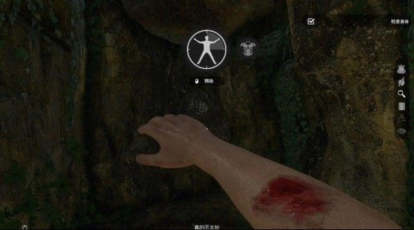 检查身体,选定右臂后转动一下,就能看到手臂受伤了。这是疗伤的首要步骤,后续要是在游戏里被咬伤或是遭到虫子寄生,都得先进行检查。包扎伤口得用绷带,打开笔记界面能查看船子草的样子,它是一种开着黄花的植物。