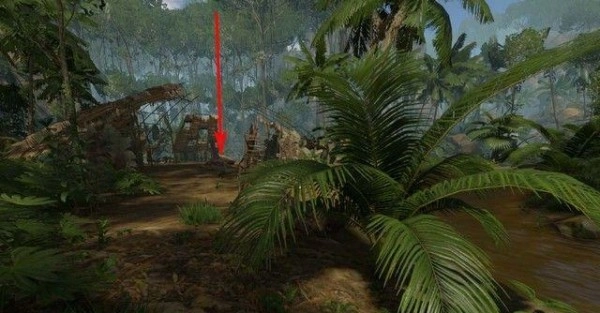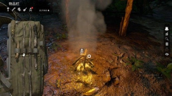 过河之后继续前行,就能找到一处废弃的原始部落,这里可以作为临时基地。如图中箭头所示,在废弃火坑内可发现一个烧毁的背包,里面装有地图,获取后即可接取调查地点的任务。