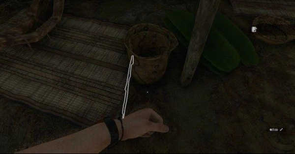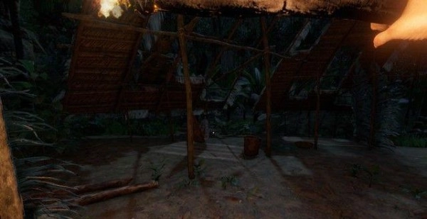 不过,因为工作量比较大,我们的石刀没一会儿就损坏了。你可以前往部落废墟的吊床位置,就像下面图片显示的那样,在桶的旁边放着骨刀,这种武器的耐久度比石刀要好得多。接下来就用它去砍树吧。