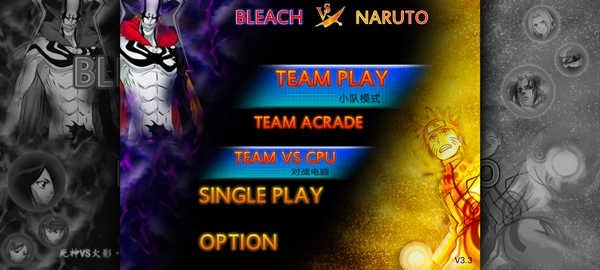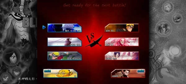 游戏内提供了死神和火影系列中的多名角色供玩家选择,玩家可以挑选3名角色组成自己的阵容,同时电脑也会有3名角色参与对局。