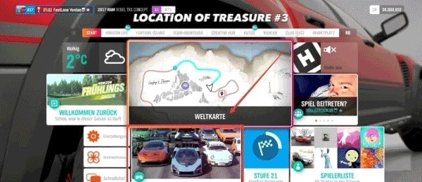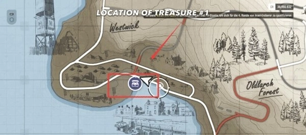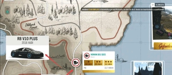 1、打开世界地图,找到财富岛宝藏2的位置,选定前往该宝藏的路线后,接着查看比赛规定使用的车型。