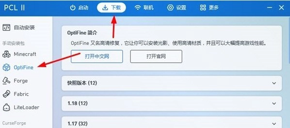 1、点击pcl启动器上方的【】,选择【OptiFine】组件,这是安装光影的必备组件(需选择与自己游戏版本对应的选项)