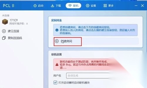 1、启动PCL2启动器后,点击顶部的联机频道选项,接着点击右侧的【创建房间】按钮。