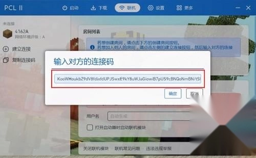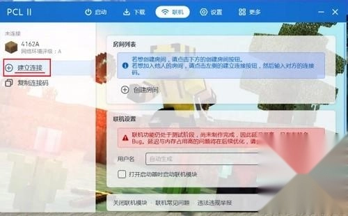 1、启动PCL2启动器后,点击顶部的联机频道选项,接着点击左侧栏中的【建立连接】按钮。